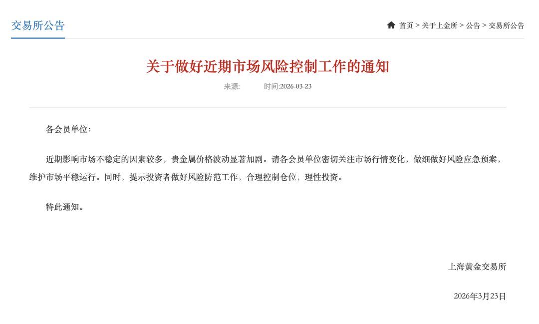 3月23日上午,国内金价迅速跌破1000元/克。上海黄金交易所官网显示,上海金早盘价报982.63元/克,上海银早盘价报16718元/千克。 ![]() ![]() △上海黄金交易所网页截图 截至发稿,国内金价跌破980元/克。受金价“跳水”影响,今天(23日),国内多家金店足金饰品价格下调。 上周,国际油价飙升引发市场对全球通胀卷土重来的担忧,美元指数上涨、多国央行集体释放鹰派信号,在中东地缘冲突已持续多日的情况下,黄金作为传统避险资产出现连续第三周下跌。其中,纽约商品交易所黄金期货主力合约价格下跌9.62%,创下15年来最大的单周跌幅;白银期货主力合约价格下跌14.36%。 上金所:关于做好近期市场风险控制工作的通知 上海黄金交易所23日发布通知:近期影响市场不稳定的因素较多,贵金属价格波动显著加剧。请各会员单位密切关注市场行情变化,做细做好风险应急预案,维护市场平稳运行。同时,提示投资者做好风险防范工作,合理控制仓位,理性投资。 ![]() |
